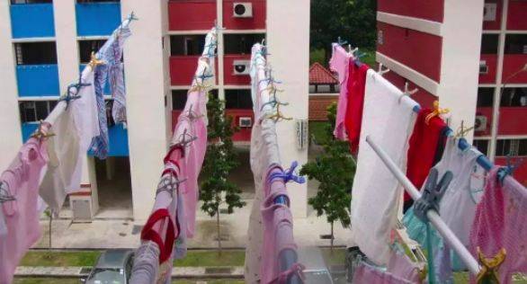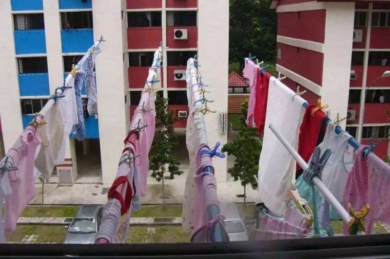 在新加坡,組屋一般是沒有陽台的,因此晾衣服需要先把衣服晾在竹竿上,然後再插進窗外的洞口中。