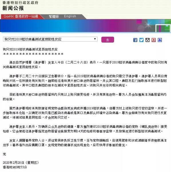 據香港特區政府漁農自然護理署(漁護署)發言人2月28日發布消息稱,一條居于新冠肺炎確診者家中的狗對有關病毒測試呈弱陽性反應。