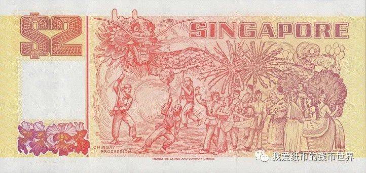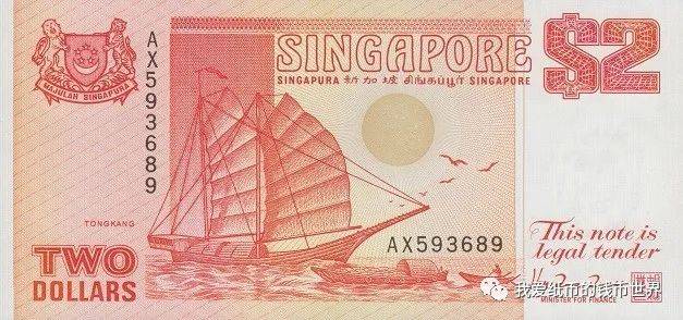 1991年版的2元券“紅帆船”,它的印制工藝明顯高于以後出現的“紫色版”2元。其正面設計簡潔明快,有一帆風順的含義,帆船正前方碩大、金燦燦的太陽(螢光下更精彩)格外醒目,背面展現了新加坡不同民族的人們歡度節日的熱烈場面,給人非常喜慶祥和的氣氛。2元券的設計依然有不統一的現象,本人猜測這一券別是最後設計並印刷的,它完全是作爲補充面值出現的。