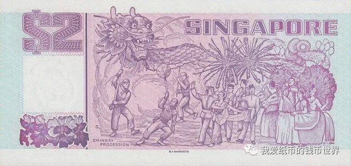 2元券的背面還出現了另外一個標記B A BANKNOTE。這也是一家公司嗎?還需進一步的考證,如果是那樣,新加坡的2元券就不但有顔色的大幅度變化,而且還有多達三家公司的印制經曆。(補充:B.A公司爲加拿大印鈔公司)