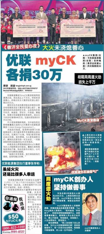 值得一提的是,剛剛遭遇了火災的兩個企業my CK和優聯能源,盡管損失慘重但依然不忘爲公益盡一分力量。“相信不斷的做善事,好人會一生平安的”my CK的創辦人在接受采訪時說到。