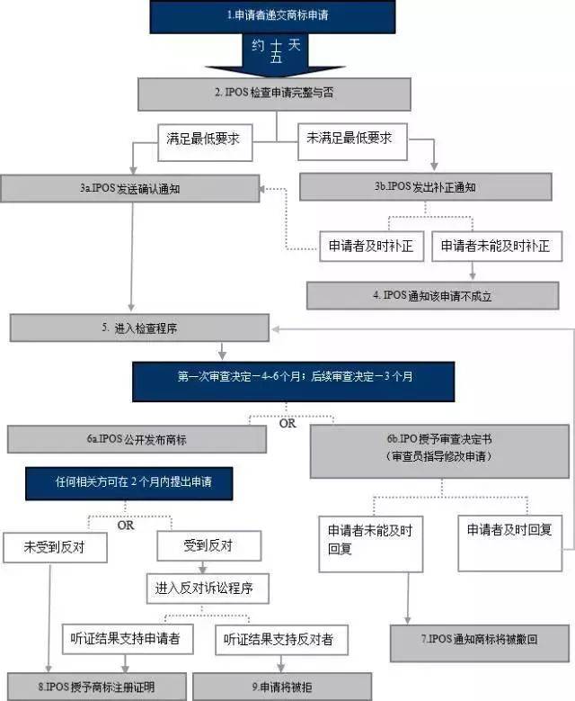 步驟:一般來說,在新加坡申請商標需要4—6個月左右,當然這不包括自己前期准備相關材料的時間。該期間內具體申請步驟見下圖: