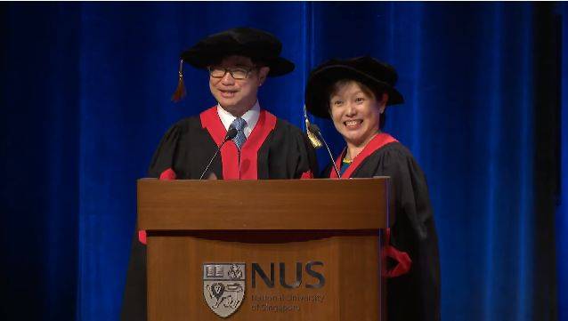 比如,在今年商學院首場C18典禮中,這兩位——黃慶生(Eugene Wong) 、陳美儀(Emily Chan)。他們夫妻倆既是國大商學院校友,同時也是獎學金捐贈人。能在這麽重要的場合,夫妻雙雙在畢業典禮現場發言,應該也是爲數不多的景象。