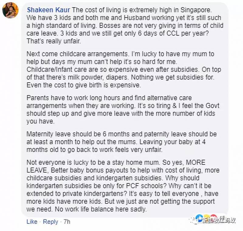 在留言中,很多父母把生育率下滑的原因歸咎于育兒假太短,他們建議延長育兒假,並根據育有的孩子人數來調整育兒假的長短。目前無論你有多少個孩子,在職父母每年各有六天的育兒假。
