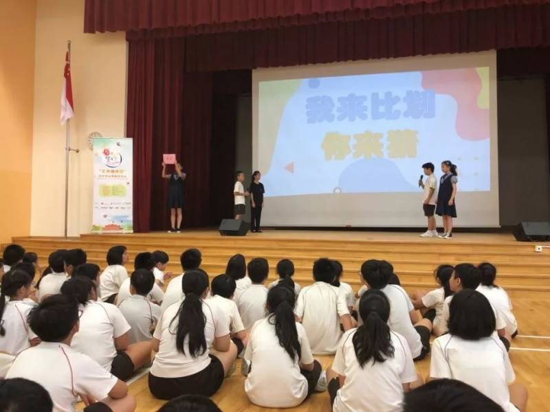 活動中,革新裏小學的學生們以昂揚的狀態向各所學校的師生們介紹了自己,展示了少年兒童的風采與朝氣。在“你比劃我猜”的戲劇小遊戲中,兩國學生通過相互配合,在誇張幽默的肢體表演中迅速拉近彼此的距離,同時也讓新加坡小學生們在遊戲中感受中華傳統文化的魅力與精髓。
