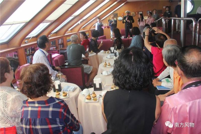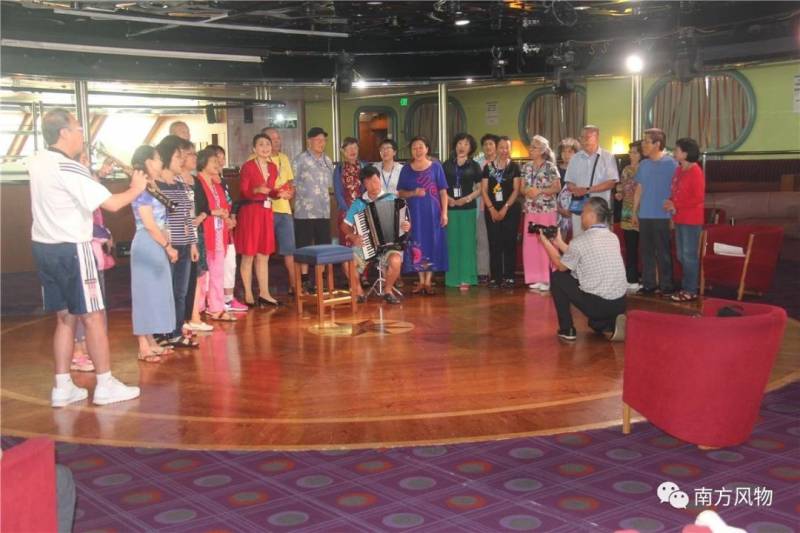 在船頂甲板、九樓後方、巴伊雅音樂廳,經常會見到一幫人在“吹拉彈唱”。其中最活躍的是來自北京的退休教師陳膺和東京某研究所研究員京子。陳膺是退休音樂老師,參加“環球遊”他很興奮,特意帶上了小號和手風琴上船。可別說,這兩樣樂器還真派上了用場,讓他在船上交上了不少志同道合的朋友,成爲船上最快樂的人。京子出生在北京,長大後到日本留學,後來嫁到日本並加入日本國籍,她多才多藝,能唱歌會指揮。因爲音樂,陳膺、京子聯絡了更多的人經常在甲板上一起唱歌、跳舞,後來,他們還牽頭成立了“和平號合唱團”,中國人、日本人、新加坡人、馬來西亞人等音樂愛好者都加入了進來,成爲全船人在茫茫大海航行中快樂的源泉。