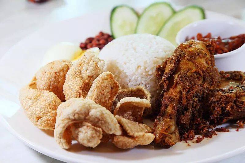 椰漿飯是馬來人的食物,通常一份米飯配有一個炸雞翅,一些炸小魚和炸花生,再有幾片黃瓜,一點辣椒醬,不用吃,光看這些名字嘴角都要起泡了。