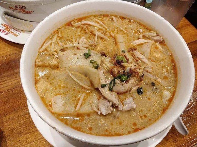 叻沙的特點在于它的湯汁,不知道裏面是什麽食材,一大鍋看起來很渾濁,有點像村裏佩奇們吃的食物,味道腥腥的。