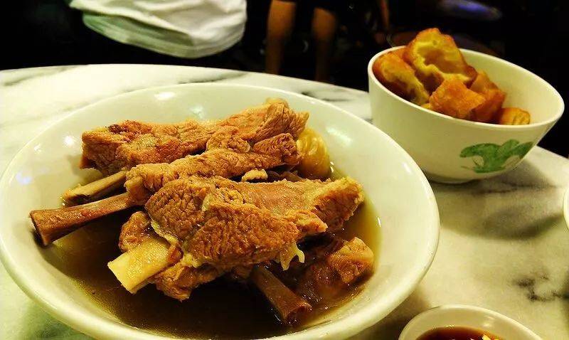 新加坡的肉骨茶其實就是胡椒味排骨湯,一碗裏面三兩根排骨,炖得很酥軟,配一小碟菜尾,也就是鹹菜,再來一份油條,油條蘸著湯吃,排骨不要馬上吃完,留一根在碗裏,憑著這一根排骨就可以理直氣壯地無限續湯。