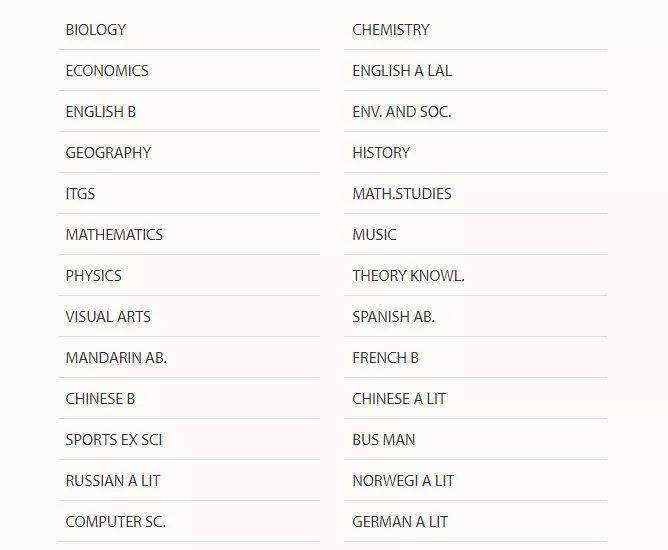 Nexus國際學校的IB課程目前涵蓋了數學、英語A LAL、化學、生物、經濟、地理、物理、曆史、等26個科目。具體IB科目如下: