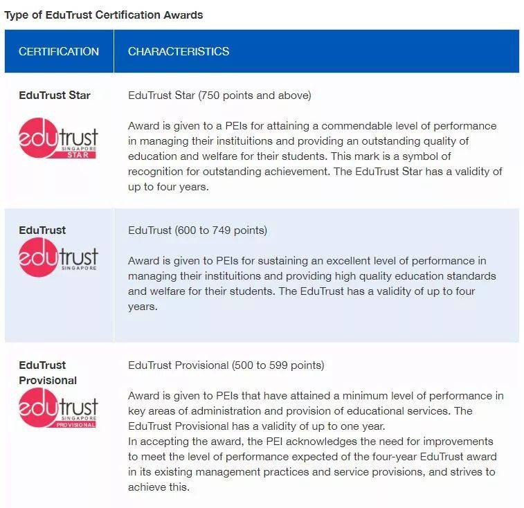 EduTrust認證主要由新加坡政府對非公立教育機構的學術水平、財務流程、行政管理、質量監督以及學校爲學生所提供的保護和福利政策進行審核,是新加坡非公立高等教育機構招收國際留學生的前提條件。