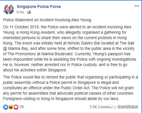 在香港反修例風波中撐港警的香港“華記”茶餐廳老板楊官華,因涉嫌在新加坡舉行具政治性質的集會,已證實被新加坡警方扣留護照調查,但沒被拘捕,在配合調查期間,仍可以在新加坡自由活動。
