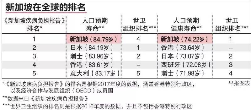 在《1990年至2017年新加坡疾病負擔報告》中提到,根據世界衛生組織統計,新加坡目前擁有世界最低的嬰兒死亡率(等同于冰島),新加坡人的預期壽命或爲全球第一,爲84.79歲,平均健康壽命爲74.22歲 [3]。新加坡曆年醫療費用總額占國民生産總額低于4%,經濟合作組織國家平均爲10%。(新加坡統計局)。