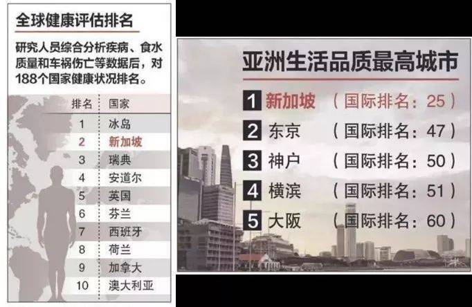 *2016年,醫學期刊《柳葉刀》按聯合國可持續發展標准評估結果,以聯合國可持續發展標准爲參考指標,新加坡的醫療與衛生狀況,全球188個國家中排名第二,是前20名裏面唯一的亞洲國家。
