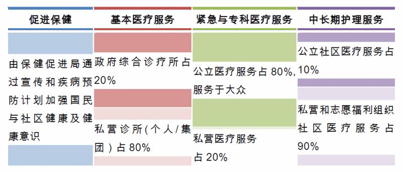 新加坡的醫療服務主要分爲如下4大板塊,各盡其責又相互輔助。醫療業者之間不是單純競爭的關系, 而是一種健康合理的公立和私立之間相互合作共贏的格局。