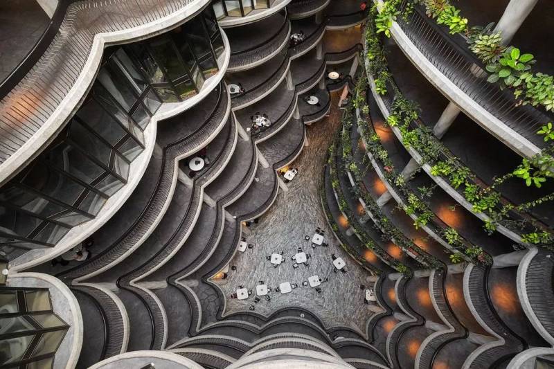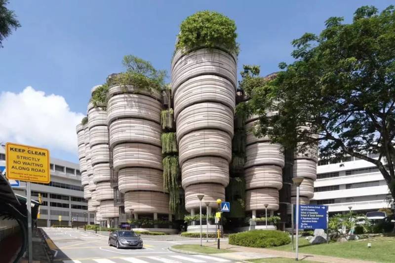 “The Hive”是一座蜂巢式的基于互聯網時代的大學交流中心,因其形似廣式早茶文化裏的蒸籠,又得一昵稱“小籠包”。它是英國建築師托馬斯·赫斯維克(Thomas Heatherwick)第一個真正意義上落成的建築作品。建築是在混凝土加入了顔料才得到這種特殊的淺色系;建築沒有主入口也沒有大門,可以從各個方向進入中庭;開放的中庭空間使得圍繞教室的空氣得到最大化循環,對身處熱帶的新加坡來說再合適不過。