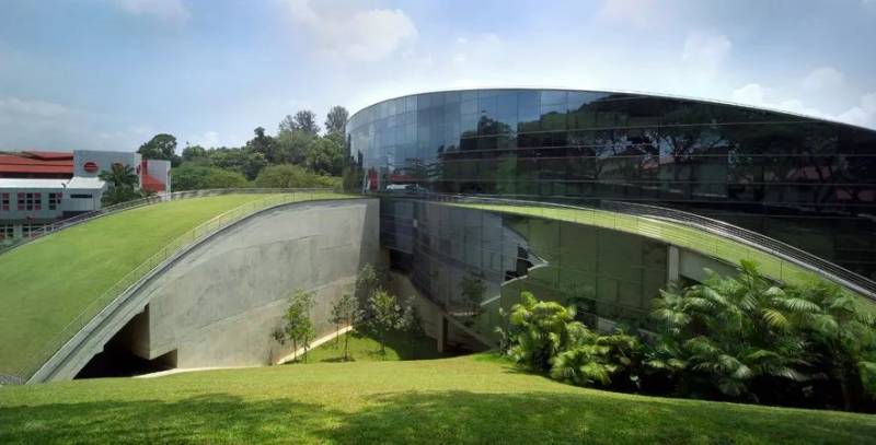 位于南洋理工大學校園內的這座建築,毫無疑問最吸睛的部分是它的屋頂:相互交織的綠色屋頂看起來就像與校園地形融爲一體,面向內部水池花園的一面爲玻璃幕牆,綠色屋頂地下則是混凝土教學樓。在強烈的視覺沖擊力之外,草坪屋頂不僅可以爲建築及其周邊環境降溫,也作爲校園內公共活動空間的一部分使用(設有台階可登上屋頂)。