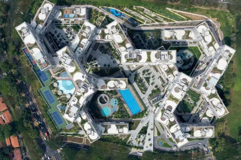 The Interlace是新加坡一項備受矚目的大型兼新型高端公寓住宅綜合體。項目由OMA建築事務所及奧雷·舍人(Ole Scheeren)共同設計,這種相互交替的建築類型打破了新加坡建築標准都是獨棟樓的准則,一個個垂直的公寓樓相互交錯疊放,以一種特殊的方式探索截然不同的熱帶生活方式:一個通過公共空間和生活空間與自然環境集成而形成的擴展的生活互聯網。