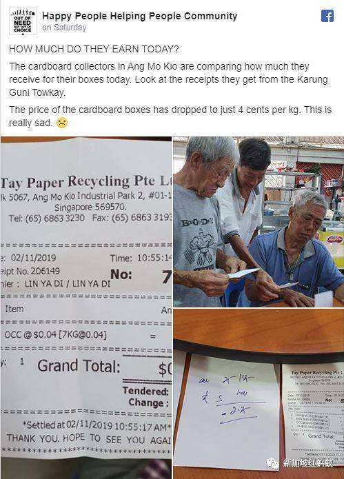 前天(3日), 慈善團體Happy People Helping People Community在面簿專頁上發布了一則貼文和幾張照片,講述著一群在宏茂橋收集紙皮的阿公圍在一起,拿著加龍古尼(新加坡對收舊貨者的統稱)頭家給他們的收據,互相比較當天所賺取的‘工錢’。