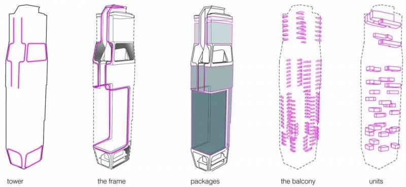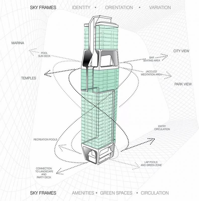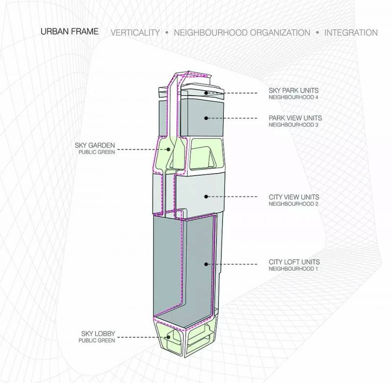垂直城市的概念與綠化區域通過兩種形式緊扣在一起:“垂直框架”和“天空框架”。垂直框架以城市方式組織塔樓。它將塔樓整合爲一個“垂直城市”,將四個住宅群劃分爲不同的小區。