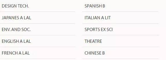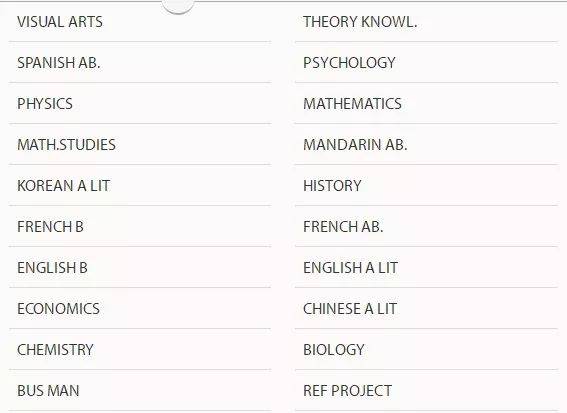 GEMS世界學院的IB課程目前涵蓋了數學、英語、化學、生物、經濟、地理、物理、等30個科目。具體IB科目如下: