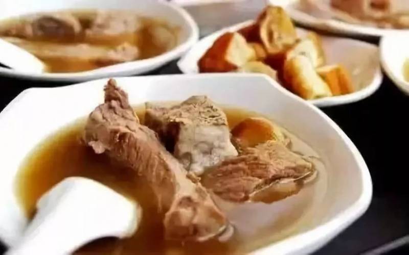 肉骨茶是馬來西亞的一道風味,用排骨和獨特的藥材一起加水煨制。其中一種是藥香濃郁的深色湯汁款,一種是以胡椒爲主調味的清湯款。肉骨茶可與米飯與面條搭配食用,油條則是最爲常見的佐茶食物。