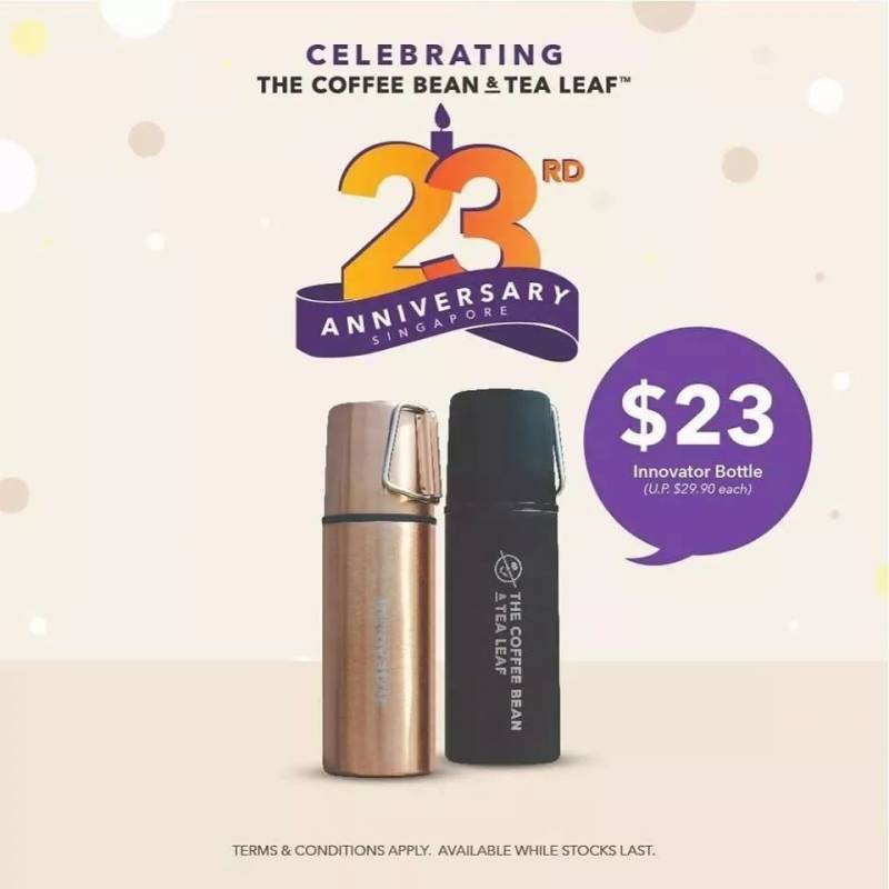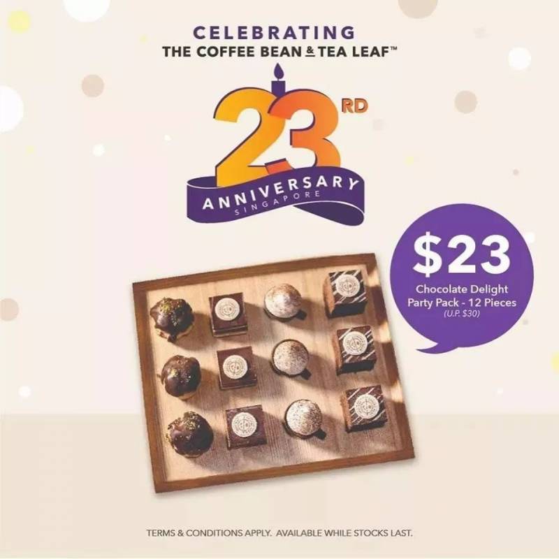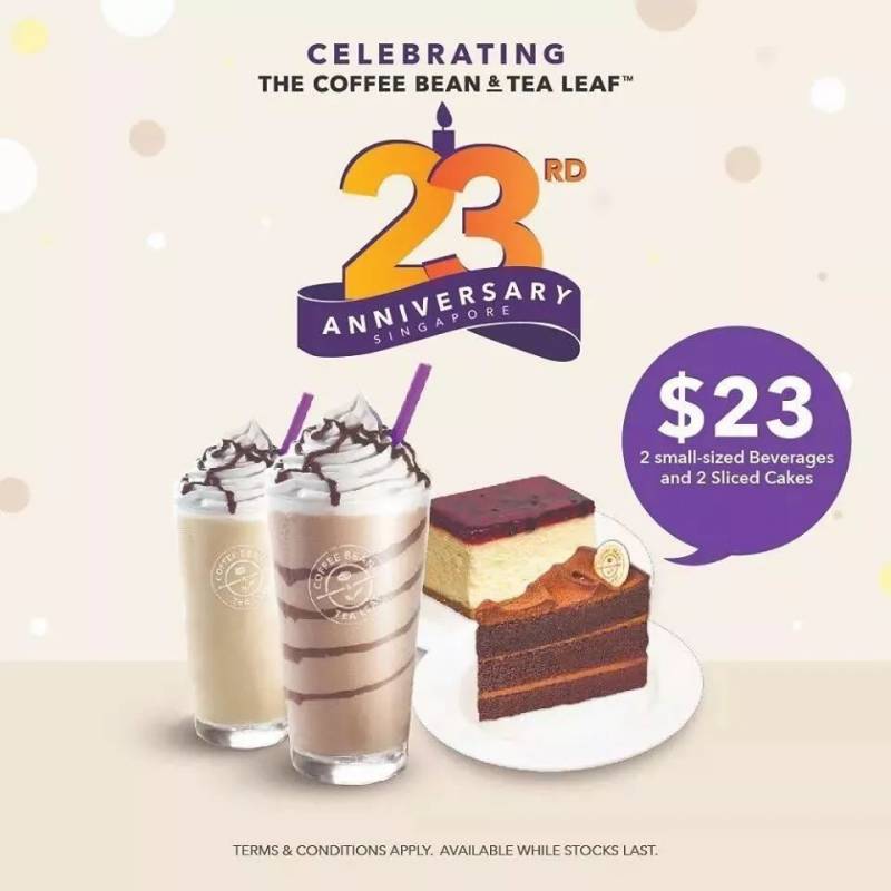 The Coffee Bean & Tea Leaf爲慶祝來到新加坡的第23周年,推出了買2送3活動+$23特價套餐!12枚的巧克力套裝,2杯雪頂咖啡+2塊蛋糕雙人甜品套餐,以及原價$29.9的杯子,現在都只要$23!