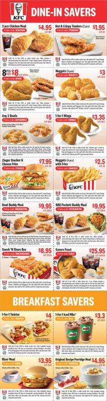地點:除樟宜機場,新加坡動物園和KidZania門店外其他肯德基門店