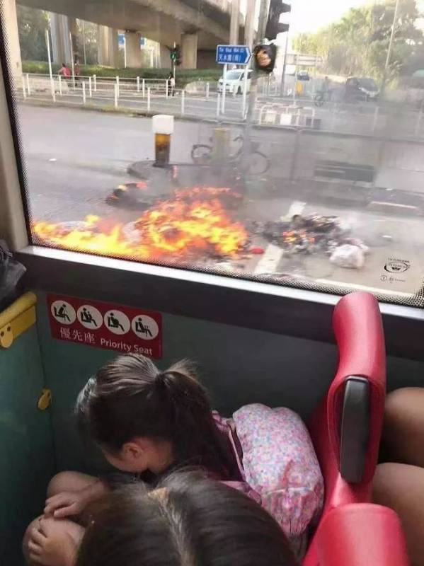 更讓人氣憤的是,有學校校車也受到汽油彈波及。目前,尚未知道校車上是否載有學生,來自哪所學校。而另一張在互聯網上廣爲流行的照片顯示,一輛公交車外火苗熊熊,而車內的小朋友恐懼地把頭壓下,躲在車窗下。