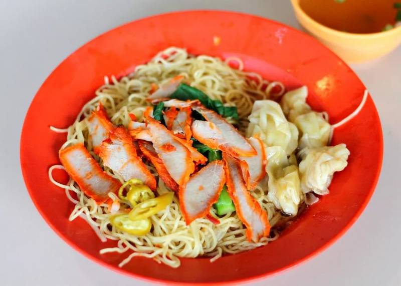 在新加坡幾乎所有小販中心美食廣場,都可以買到的一種廣受歡迎的中國粵菜是雲吞面。