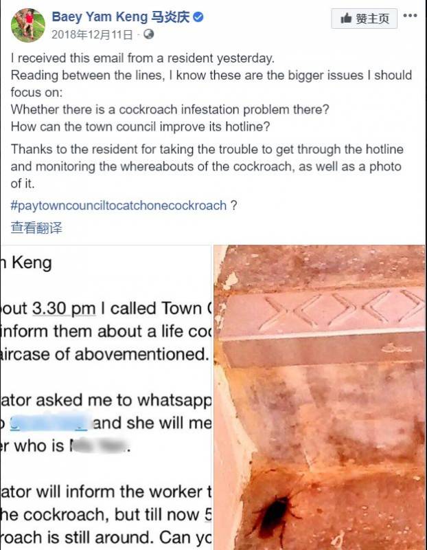 國會議員馬炎慶在臉書上稱自己應該關注更大的事情,例如是否有蟑螂感染問題。
