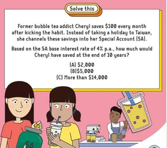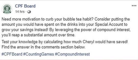 公積金局發貼文透過趣味數學題,建議公衆少喝泡泡茶少旅行,把錢放在特別戶頭錢生錢。