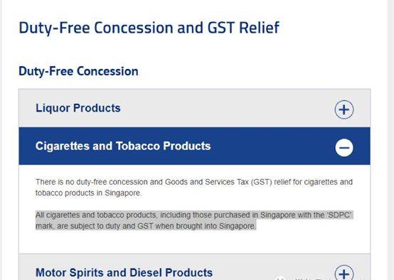 根據新加坡海關規定:新加坡沒有對香煙和煙草制品的免稅特許權和商品服務稅(GST)的減免。