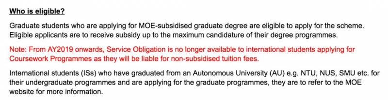 從2019年起,教育部補貼僅適用于新加坡公民和新加坡永久居民(SPR)學生。除申請拉惹勒南國際研究學院(RSIS)的國際學生仍有資格獲得教育部補貼,申請其他專業的國際學生將不再享有教育部補貼。