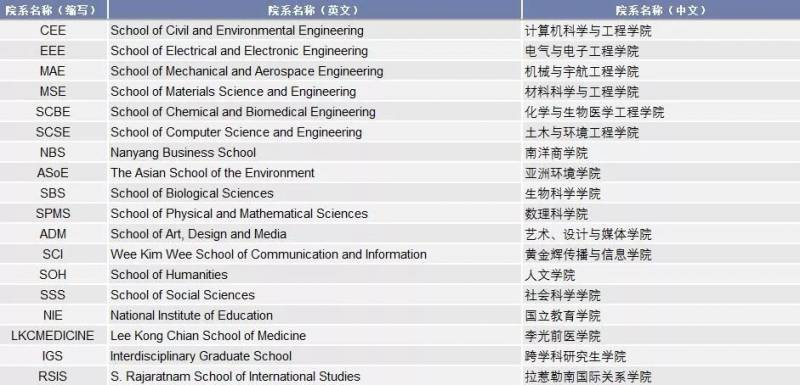 下圖爲NTU各個學院的縮寫和全稱,會挑選一些同學們最常咨詢的院系及課程,爲大家做上詳細介紹。