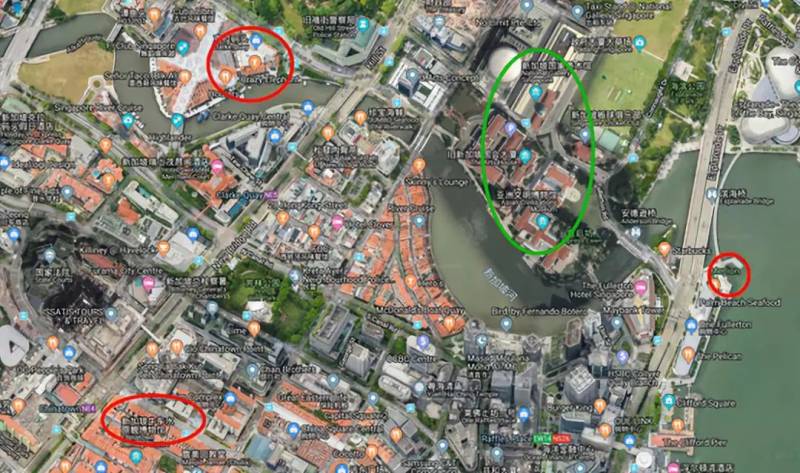 往西南的紅圈是唐人街,也就是牛車水,裏面有15塊錢的米其林油雞飯,剩下的就是旅遊紀念品一條街和宵夜一條街,我們在那裏遇見一攤主大叔,說30年前去過北京,今非昔比日新月異。街口一群老僑民唱露天卡拉OK,很有人情味。
