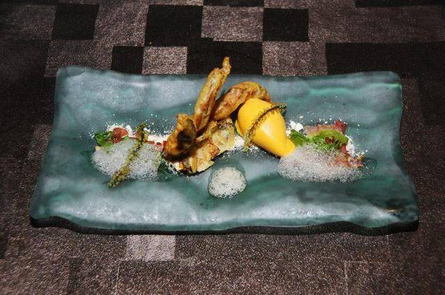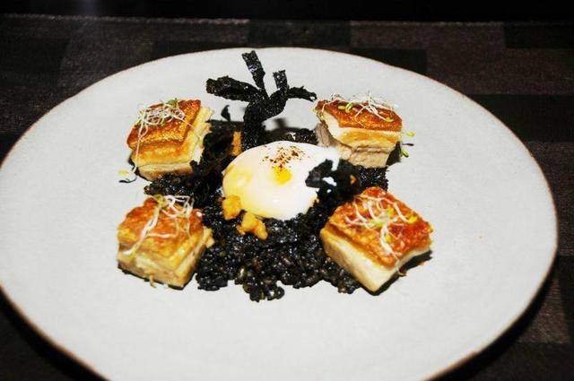 螃蟹是新加坡特産食物,Labyrinth的炸螃蟹以玫瑰鹽相佐,旁邊用細密的泡泡營造出豐富的層次感,是店內的特色料理;另一道必吃料理是三層肉,用海苔及太陽蛋的獨特搭配,將油膩去除,吃進去就能感受到原始的肉香。