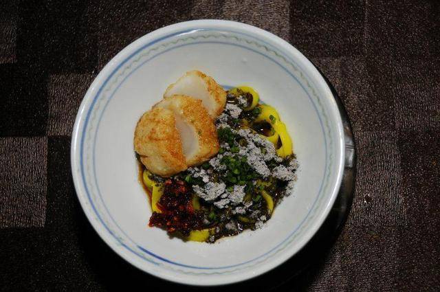 前菜烤幹貝口感甜味十足。(特派記者杜明賢攝)