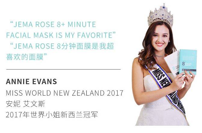 榮獲2017年世界小姐新西蘭冠軍的安妮·艾文斯表示:Jema rose8分鍾面膜是我超喜歡的面膜!