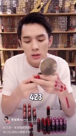 李佳琦強推的色號是423號色,有種像古時候宣紙抿嘴的顔色,複古紅色很顯膚色,而且很大氣,被他稱爲帶貨女王楊冪的色。而同款系列其他的紫色系色號亞洲人比較難駕馭,但是膚色稍黑的小仙女可以try一下哦。