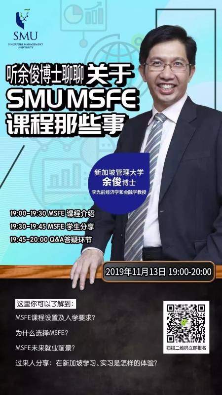 金融經濟理學碩士(MSFE)項目2020年入學申請已經開始!無論你在哪座城市,哪所高校,哪個專業,只要對課程感興趣就不妨加入11月13日(星期三)由余俊博士主講的微信線上說明會吧!聽余博士親自爲同學們答疑解惑,更有 SMU 校友分享申請和學習經驗,掃描下方二維碼,添加小新,拉你入群~