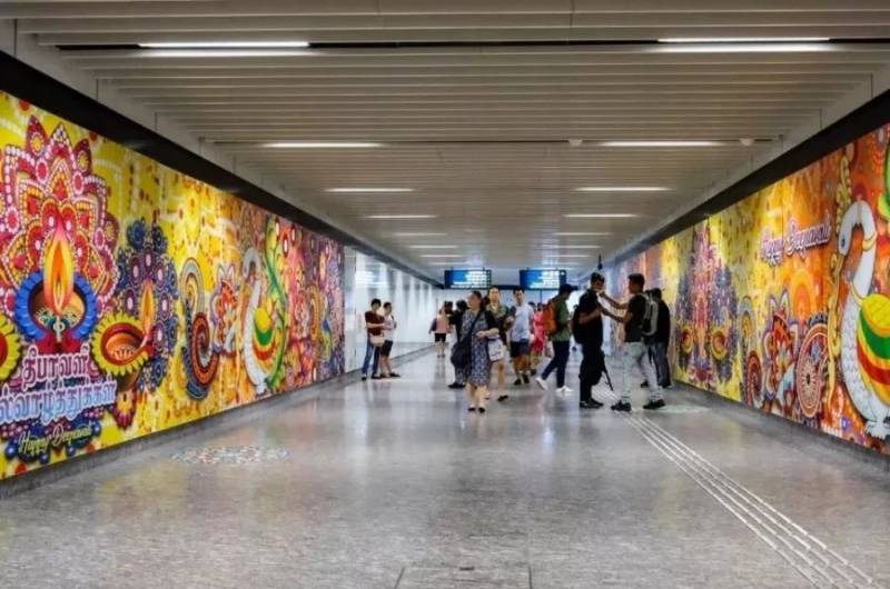在小印度地鐵站裏,往來 NorthEast Line 和 Downtown Line 之間走廊有大幅的屠妖節圖騰,五彩缤紛的設計使得地鐵站裏的節日氛圍十足!在場可以看到不止是印裔友族停下來腳步拍照,各國的遊客都會在屠妖節牆紙前拍照。