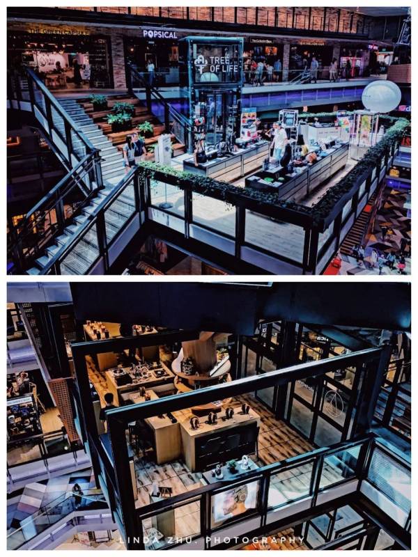 擡頭就被眼前的設計迷住了,其實這是一顆“生命之樹”。這個樹其實是一座25米高的鋼木結構建築,從B2一直到L4,樹的延伸部分可以看到各大品牌的産品展示區,樹上一共有20個科技感十足的“懸空“店鋪。充分利用了空間,站在商場高處也能往下清楚看到店鋪,或許就在這個不經意間有意外收獲,是一個不錯的購物體驗。