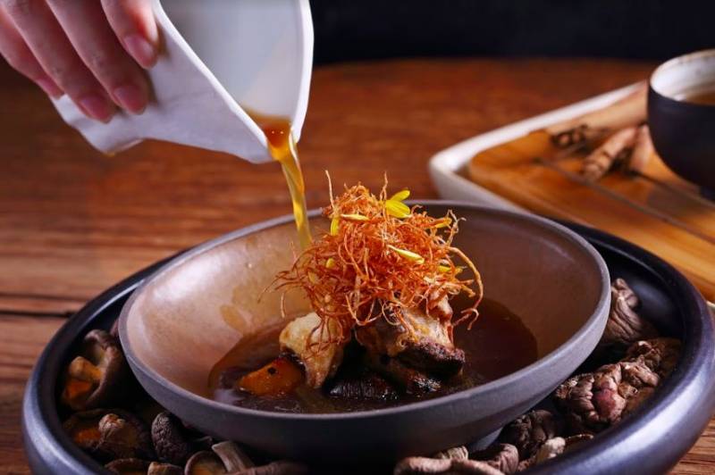 另一種方式是將新加坡小吃解構成台灣版本。例如最知名的肉骨茶,湯頭加入大量菇類熬煮,貢寮鮑魚也以肉骨茶湯慢煮至軟嫩。湯中放入大塊杏鮑菇、香菇取代排骨,且有酥炸、炖煮等不同口感。連排骨脂肪這種細節也不放過,Jimmy 神來一筆地以愛玉模擬它滑溜的質地,將這道傳統小吃創意變形。