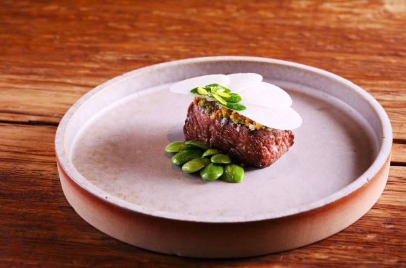 主菜安格斯牛小排則是東南亞原料的組合。馬來西亞臭豆近似臭豆腐的味道,立即爲這道西式排餐帶來南洋味。翻開圓片狀的豆薯,就能看見牛小排上鋪滿蒜酥、紅蔥頭、香茅、香菜、卡菲爾萊姆葉等香料;用馬來西亞棕梠糖“gula melaka”焦糖化的魚露,則爲肉排增添風味。