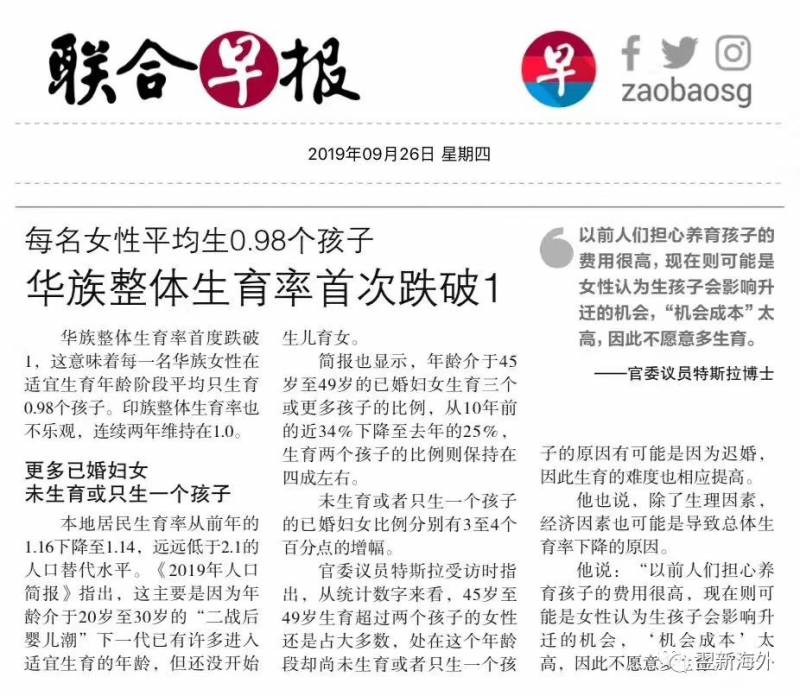 華族作爲占比最多的人口(75%),生育率更是跌破1