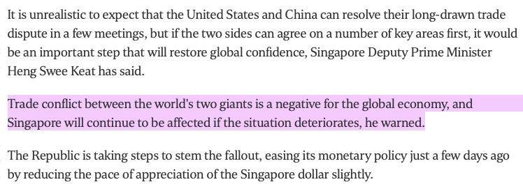 新加坡副總理王瑞傑表示,期望美中能夠在幾次會議上解決長期的貿易爭端是不現實的,但是如果雙方能夠首先就一些關鍵領域達成協議,那將是恢複全球信心的重要一步。他警告說,世界兩大巨頭之間的貿易沖突對全球經濟不利,如果局勢惡化,新加坡將繼續受到影響。