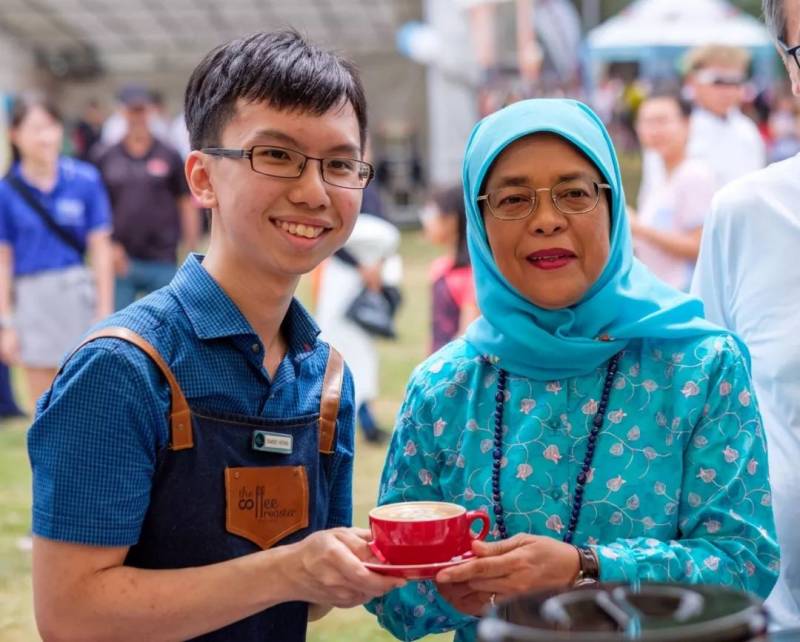 在新加坡國立大學(NUS)年度慈善活動——2019 Rag & Flag活動中,洪瑞宏請NUS名譽校長、新加坡共和國總統哈莉瑪品嘗自己煮的咖啡