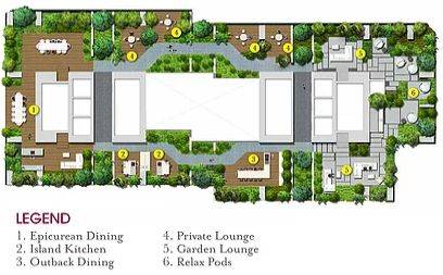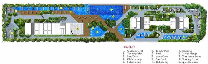 第8層:BBQ聚會地點,遊泳池,按摩浴池,兒童嬉水池,遊樂器械,用餐亭,丁香園,肉桂園,肉豆蔻園和香料植物園等。