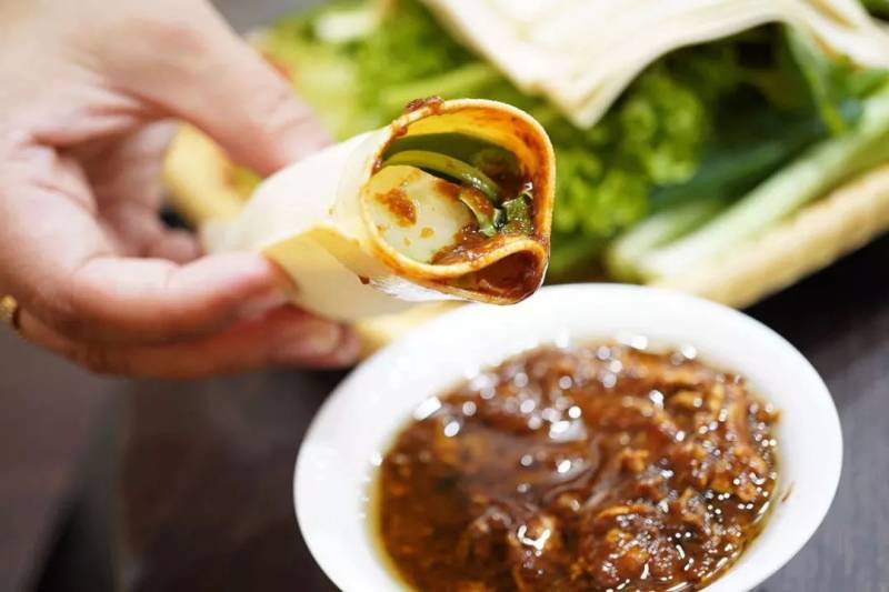 用豆腐皮包裹著蔬菜,再蘸上醬